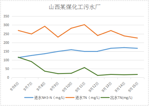 山西某煤化工污水處理廠系統(tǒng)設(shè)計(jì)1200m3/d,實(shí)際運(yùn)行處理400m3/d,調(diào)節(jié)池進(jìn)水總氮200-300mg/L,氨氮120-200mg/L,COD100-200mg/L。主體處理工藝為調(diào)節(jié)水池—氣浮池—缺氧池—三級好氧池—MBR膜池—排放,生化系統(tǒng)崩潰虧,出水總氮不達(dá)標(biāo),應(yīng)客戶要求降低總氮至25mg/L以下。