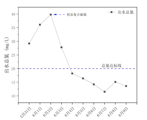 在生化系統缺氧池、氧化溝硝化液回流加入復合碳源101產品+邁葳生物調試組合技術,三天出水總氮達標,總氮<15mg/L;氨氮<0.5mg/L,實現了出水總氮達標的效果,成功為客戶降本。