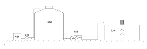 圖示從左到右為卸藥桶、氟塑料藥劑提升泵,儲藥罐,加藥泵,反應池,卸藥桶用于槽車來要接軟管倒入藥劑,然后打開提升泵將藥劑打入儲藥罐中。