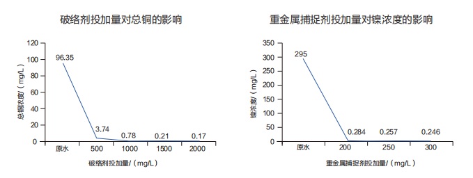 該客戶采用二級(jí)沉淀+重捕池+生化工藝,出水總銅、總鎳、總磷、總氮等均超標(biāo)。經(jīng)診斷,在混凝池前端、重捕池前端和后端加入系列配套藥劑,水中銅含量降至0.21mg/L、鎳含量降至0.25mg/L、總氮穩(wěn)定于15.00mg/L,均能達(dá)標(biāo)排放,出水穩(wěn)定,成本更低。